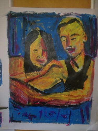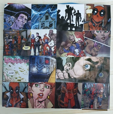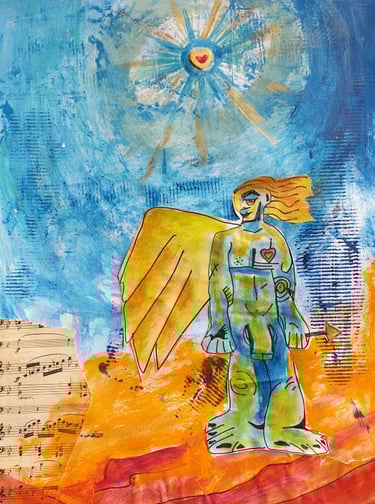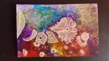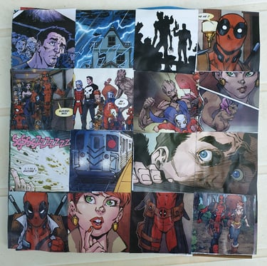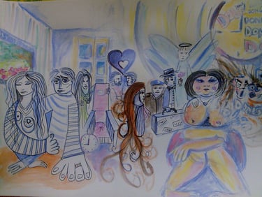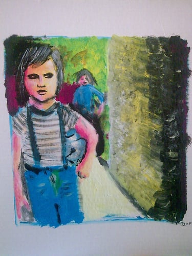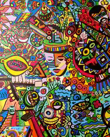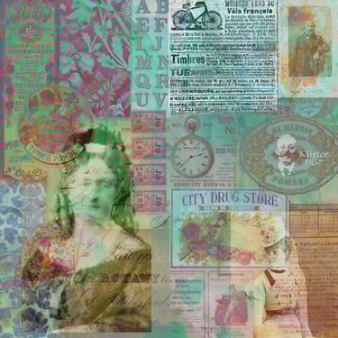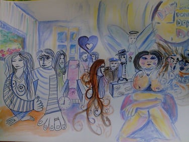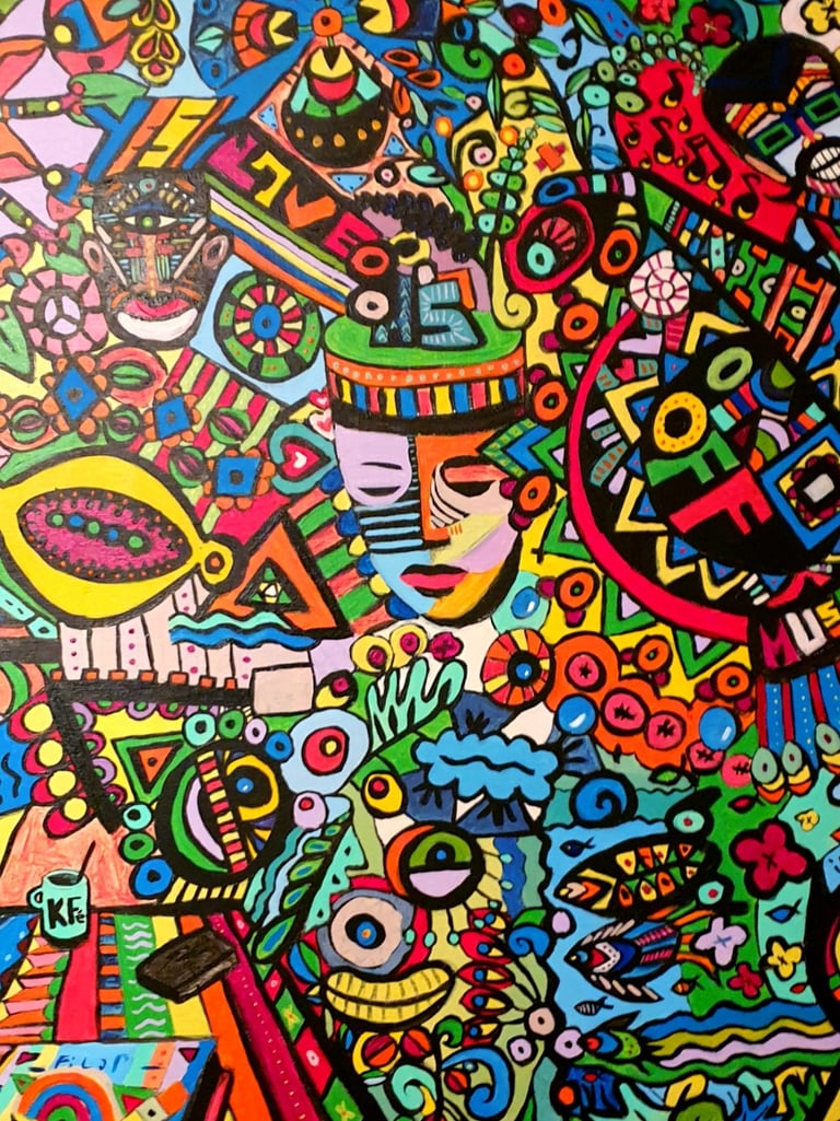 peintures acryliques, collages, bidouillages numériques, logos, dessins, photographies, sacs, crazydolls, carnets